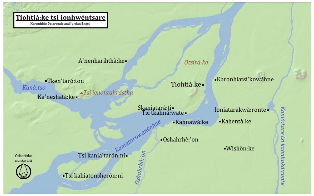 Tiohtià:ke tsi ionhwéntsare (Montréal, Québec) in Kanien’kéha (Mohawk), by Karonhí:io Delaronde and Jordan Engel. (https://decolonialatlas.wordpress.com/2015/02/04/montreal-in-mohawk/)